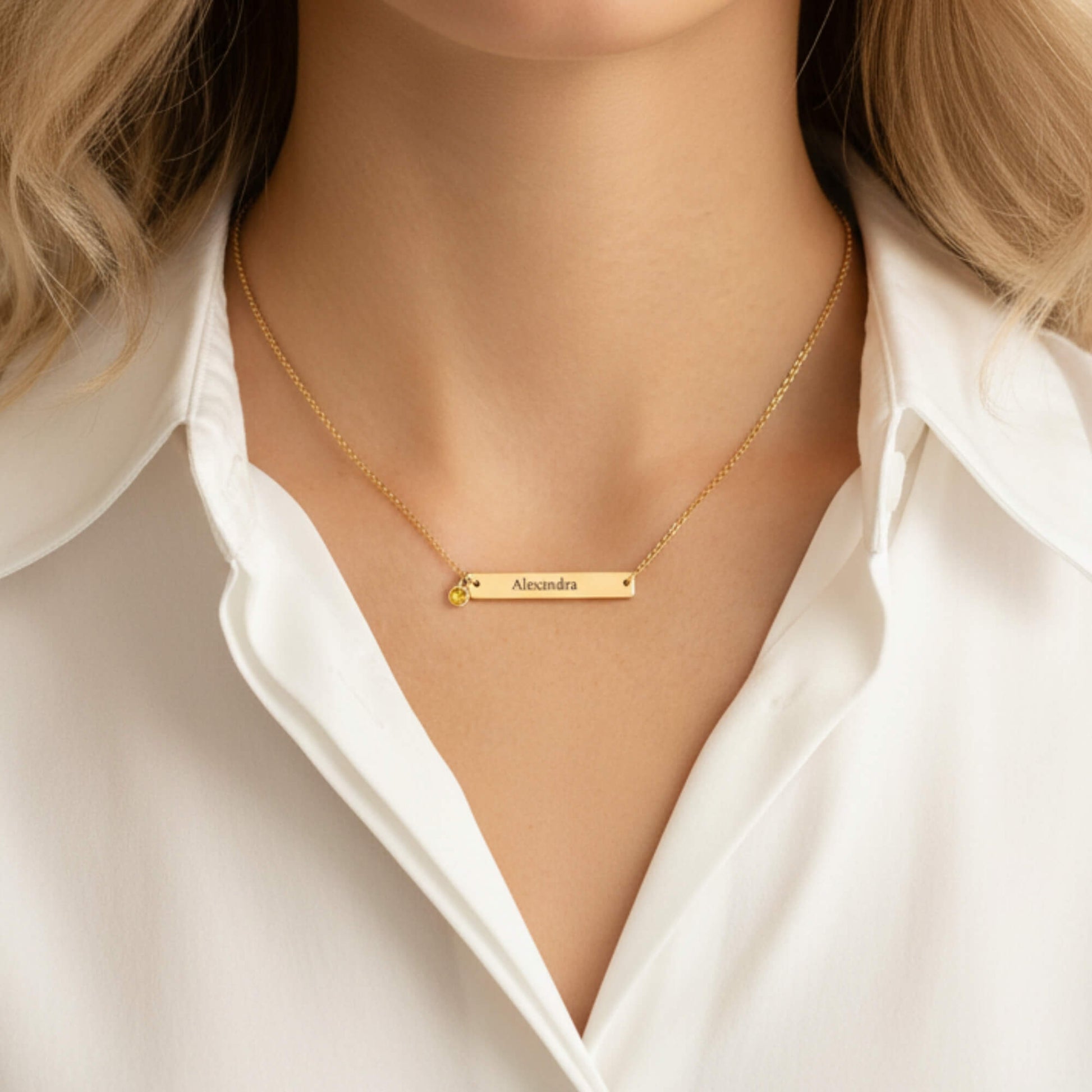 The Birthstone Name Bar Necklace combines your engraved name with a meaningful birthstone that matches your birth month for a personalized, timeless piece. Made from high-quality stainless steel, it’s a beautiful everyday accessory and the perfect personalized gift for any occasion.