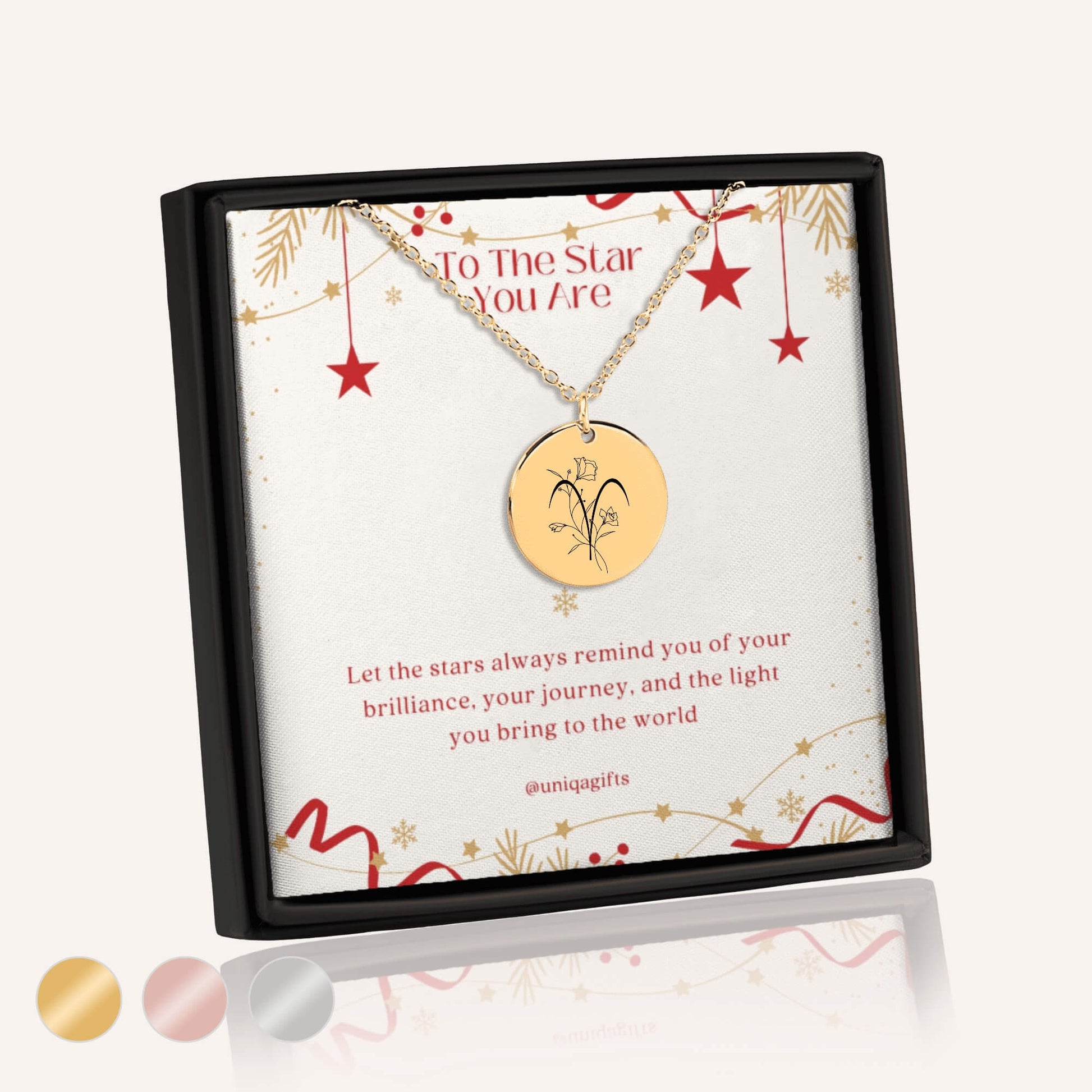 This delicate piece features your zodiac sign paired with its symbolic flower, beautifully engraved for a timeless and meaningful touch. Made of high-quality stainless steel, it’s both elegant and lasting. Arrives in a beautiful gift box with a designed holiday card.